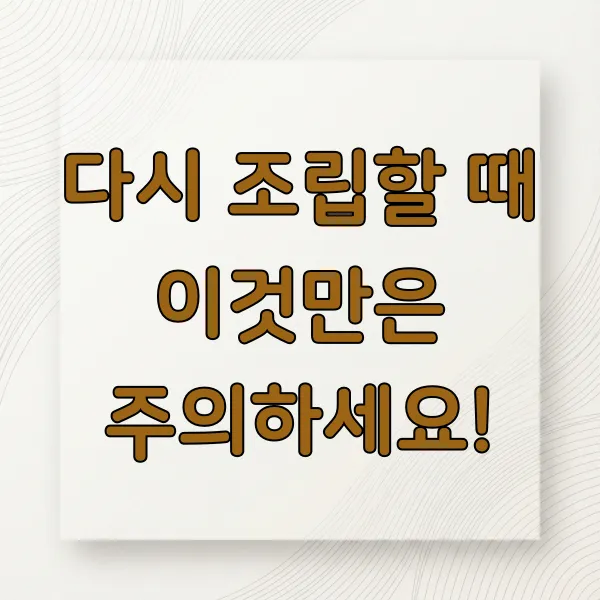 - 부품 방향 확인: 분리할 때 사진을 찍어둔 것이 빛을 발하는 순간입니다. 각 부품이 원래 방향대로 제대로 끼워졌는지 확인하세요.